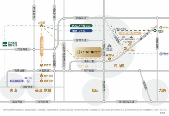 地铁:紧邻地铁14快线坪山门户站——锦龙站(约600米),12站福田岗厦北。佳华沙湖广场周边临近地铁16号线号线一站直达坪山围站换乘)、地铁19号线号线(在建)。佳华沙湖广场