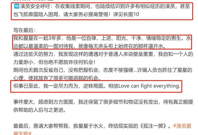 嘉嘉也很有社会担当,男友成功获救回国,她表示会总结一些求助渠道,会持续更新,愿更多“星星”找到回家的路。