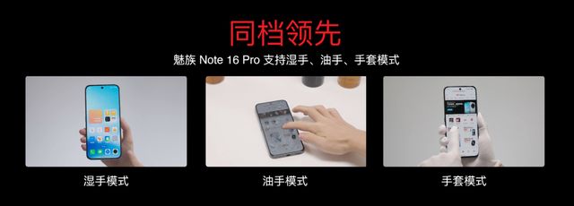 此外,魅族 Note 16 Pro 的屏幕具备极高的灵敏度,支持全场景湿手、油手、手套模式,不管是手指沾水、手指沾油,甚至是戴上手套,也能灵敏识别用户的每一次点击,全面提升触控体验。