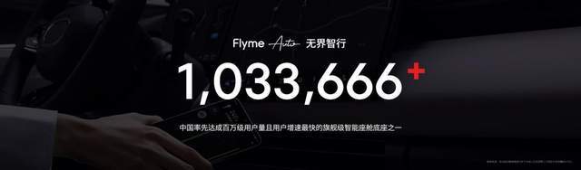 在新品发布会上,星纪魅族公布了 Flyme Auto 智能座舱系统的最新成绩——生态用户数率先突破百万,截至 5 月 13 日用户总量达到 1033666。