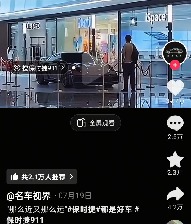 故事得从一个热门视频说起,画面中,一个背包男生站在展台前,静静欣赏眼前的保时捷911,配文是“那么近,又那么远”。