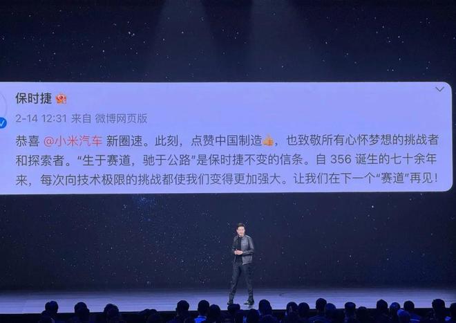 “恭喜小米汽车新圈速。此刻,点赞中国制造,也致敬所有心怀梦想的挑战者和探索者。 ‘生于赛道,驰于公路’是保时捷不变的信条。自356诞生的七十余年来,每次向技术极限的挑战都使我们变得更加强大。让我们在下一个‘赛道’再见!”